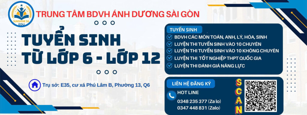 Trung tâm Bồi Dưỡng Văn Hóa Ánh Dương Sài Gòn là nơi đồng hành uy tín cùng học sinh từ lớp 6 đến lớp 12 trong hành trình chinh phục tri thức và vượt qua các kỳ thi quan trọng. Với đội ngũ giáo viên tâm huyết, giàu kinh nghiệm và phương pháp giảng dạy hiện đại, Ánh Dương tự hào là lựa chọn hàng đầu của các bậc phụ huynh và học sinh tại TP. Hồ Chí Minh.